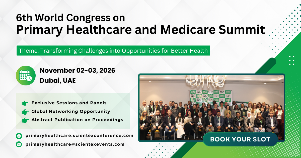 The 6th World Congress on Primary Healthcare and Medicare Summit, scheduled for November 02–03, 2026 in Dubai, UAE, brings together global healthcare leaders, researchers, and innovators to advance primary healthcare. Under the theme “Transforming Challenges into Opportunities for Better Health,” the congress features keynote lectures, panel discussions, workshops, and research presentations focused on emerging trends, innovations, and strategies to improve health outcomes and strengthen primary healthcare systems worldwide.
