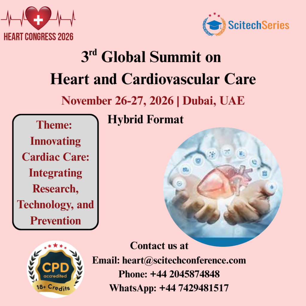 ScitechSeries is pleased to extend an invitation for your participation in the esteemed "3rd Global Summit on Heart and Cardiovascular Care," a Hybrid Event scheduled to take place in Dubai, UAE, from November 26-27, 2026. This unique Hybrid format provides the flexibility for attendees to join either in person in Dubai or virtually from the comfort of their homes or workplaces.