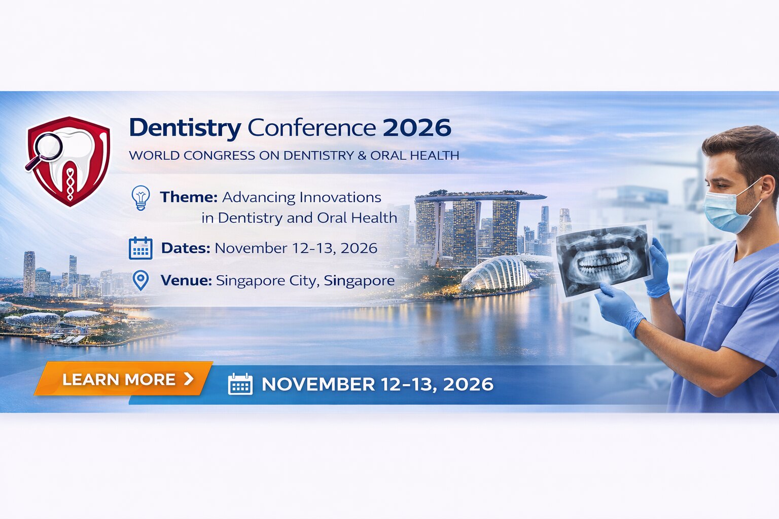 Welcome to the World Congress on Dentistry & Oral health (Dentistry Conference 2026), a premier hybrid event poised to advance the future of dental science and patient care. This landmark congress will convene in Singapore City, Singapore from November 12-13, 2026. With a central theme of "Advancing Innovations in Dentistry and Oral Health," Dentistry Conference 2026, is designed to provide a comprehensive and inclusive experience, offering both in-person and virtual participation options to accommodate all attendees. Dentistry Conference 2026 will bring together a diverse assembly of leading dental researchers, esteemed clinicians, cutting-edge innovators, and dedicated practitioners from around the globe.